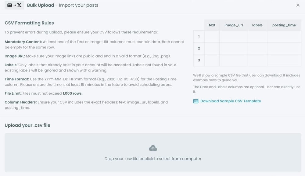 YYYY-MM-DD HH:mmformat. Scheduled times must be at least 15 minutes in the future to prevent accidental immediate posting. - Exact column headers: The system reads data based on column names. Headers must remain exactly as follows: