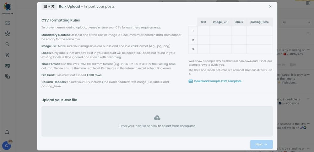 Circleboom uses a simple CSV-based system for bulk uploads. At first, CSV files may seem technical, but they are actually a practical way to structure your tweets with content, media, and posting times.